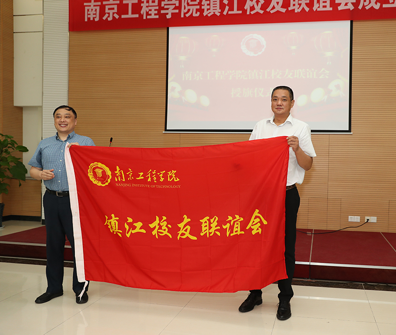 史金飞院长和顾问卜晓放、刘勇校友共同为镇江校友联谊会揭牌,史院长向镇江校友联谊会授予会旗。