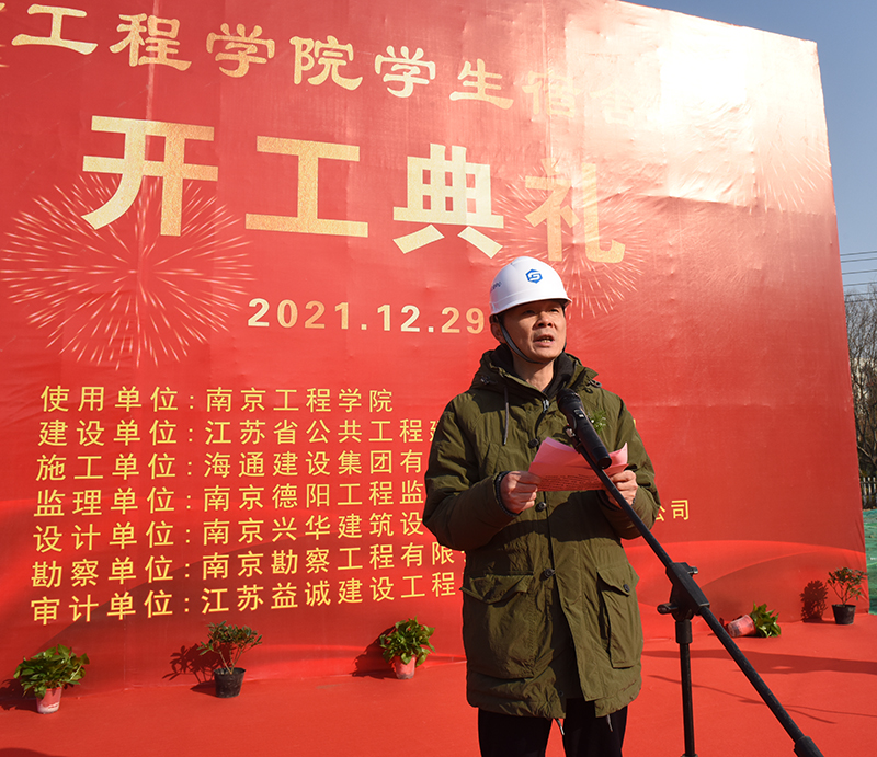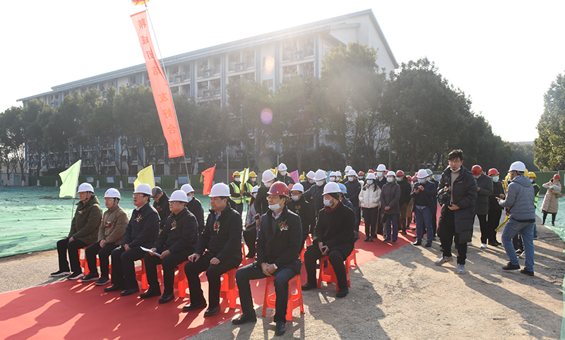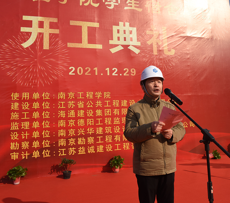 开工仪式在位于校园北侧学生生活区的项目现场举行。我校党委书记史国君,党委常委、副院长杨征宇、朱晓春,省住房和城乡建设厅集中建设处处长曹良春,省公共工程建设中心有限公司副总经理娄永峰,海通建设集团有限公司总经理董善勤,南京兴华建筑设计研究院股份有限公司院长陈卫新,南京德阳工程监理咨询有限公司副总经理方明,南京勘察工程有限公司总工李树德,江苏益诚建设工程咨询有限公司总工汪义平等出席开工仪式。开工仪式由省公共工程建设中心工程管理部副总经理梁石主持。
