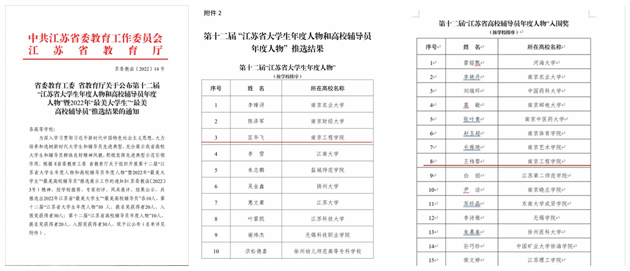近日,省委教育工委、省教育厅公布第十二届“江苏省大学生年度人物和高校辅导员年度人物”暨2022年“最美大学生”“最美高校辅导员”推选结果,我校电力凯发电力185班的匡华飞同学荣获第十二届“江苏省大学生年度人物”,这是我校学子参评该奖项以来获得的最好成绩。自动化学院王祎黎老师获第十二届“江苏省高校辅导员年度人物”入围奖。