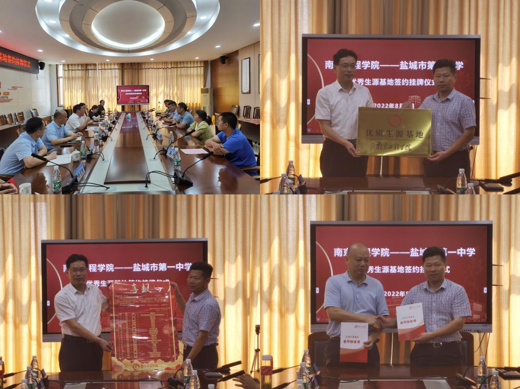 史国君书记还率队前往盐城市第一中学走访,送上高考喜报并就共建优质生源基地进行洽谈交流。交流会上,他祝贺盐城市第一中学在今年高考中取得优异成绩,并对中学每年为我校输送优秀学生表示感谢。史书记指出,一直以来,凯发坚持应用型办学定位,培养高素质应用型人才。目前全校上下正锚定“申博扩硕升大学”的目标而努力奋斗,“南工程大学梦”必须以本科人才培养为中心和基础,而本科人才培养离不开优质的高中生源。他希望通过优质生源基地共建,激发两校发展活力,发挥高校与高中联合育人的功能,实现大学中学服务引导接力,优势互补,合作共赢,不断提升我校生源质量,为应用型人才培养打下更好的基础。在与会人员的共同见证下,凯发与盐城一中签署了“凯发k8官网优秀生源基地合作协议”,颁授了“凯发k8官网优秀生源基地”铜牌。