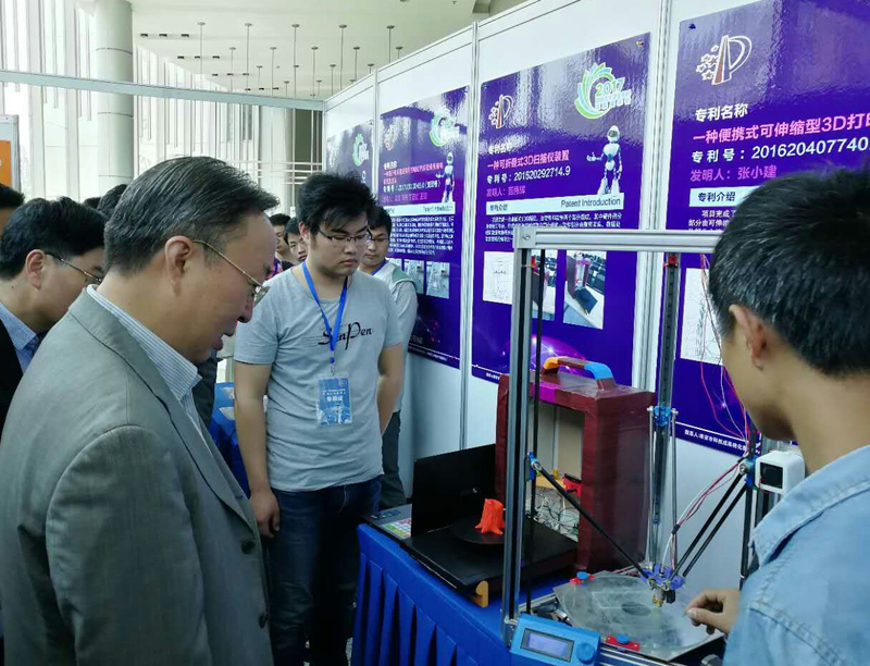 422日至423日,我校组织参加“2017年南京市大学生专利成果展示会”,推荐的21个作品全部入围展会参展。在展示会当天,南京市市委常委、常务副市长刘以安,南京市有关部门领导参观了我校范伟辉同学团队的“一种可折叠式3D扫描仪装置”、张小建同学团队的“一种便携式可伸缩型3D打印机装置”,刘副市长兴致勃勃地向发明人询问了专利的技术亮点与应用前景。我校其他同学的各项专利也都获得了到场专家评委们的一致好评。南京晨报记者对我校黄秋冬同学进行了采访,并以“折叠式3D打印机方便又实用”为题在南京晨报上做了专题报道。
