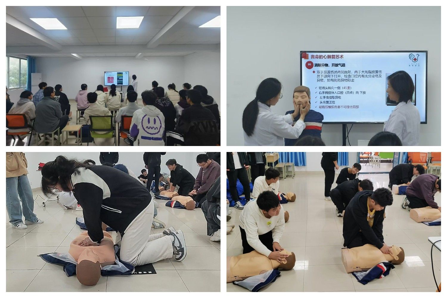应急救护,提高防范。11月15日-20日,校医院直属党支部为数理学院学生开展了为期一周的应急救护培训,培训内容涵盖了心肺复苏术(CPR)、自动化体外除颤仪(AED)使用、气道异物梗的识别与处理等关键急救技能。培训现场,校医院党员老师进行理论讲解、现场示范以及手把手指导操作,师生认真聆听、实训操作、严格考核,所有学生均取得了CPR+AED证书。数理学院以此次培训为契机,实现了学生应急救护培训全覆盖,增强了学生安全防范意识。