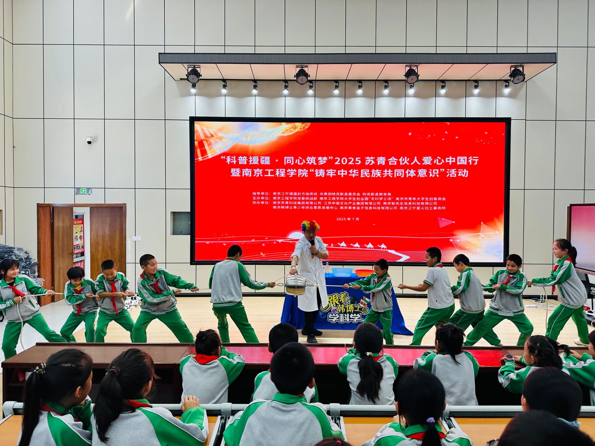 近日,由我校党委统战部牵头,联合南京江宁援疆前方指挥组、特克斯团县委、苏青合伙人、南京市青年大学生创客商会等单位,在新疆特克斯县江宁实验小学、特克斯镇阿热勒社区成功举办“科普援疆·同心筑梦”2025爱心中国行暨“铸牢中华民族共同体意识”主题活动。活动通过科技展演、科技体验等形式,旨在激发新疆青少年的科学兴趣,促进民族团结与文化交流。
